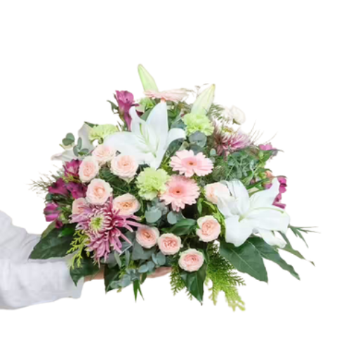 Centro floral sencillo en tonos suaves, ideal para acompañar discretamente en ceremonias y transmitir condolencias con sencillez y respeto.