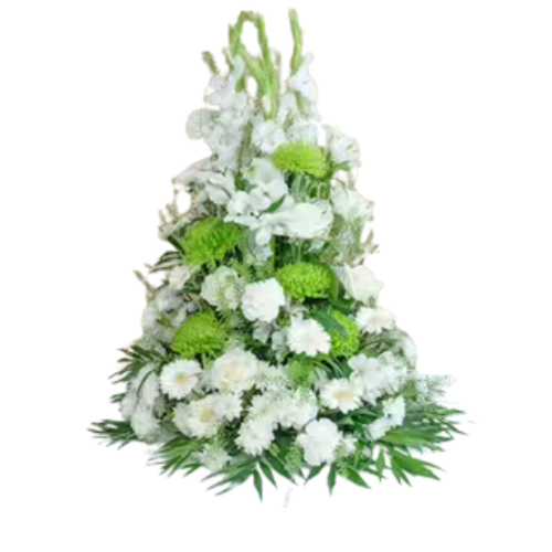 Composición en blanco puro, símbolo de paz y descanso eterno. Una creación sobria y solemne para expresar condolencias con gran respeto.