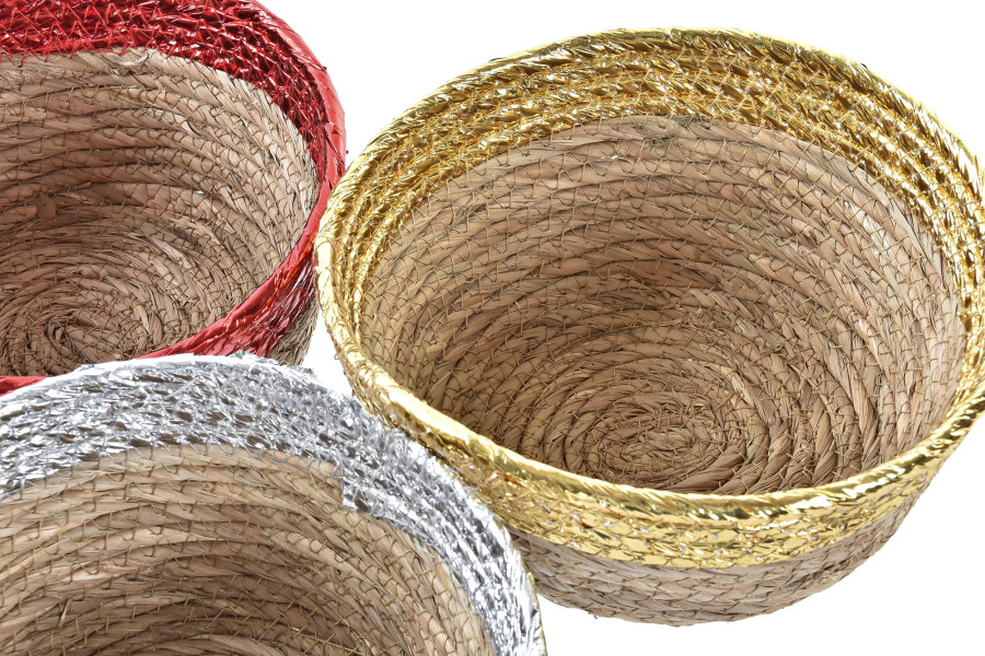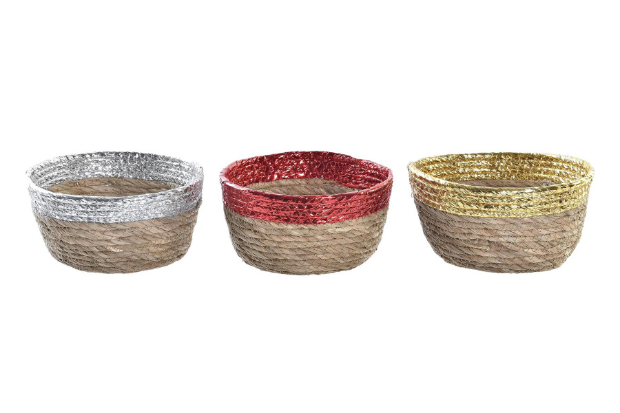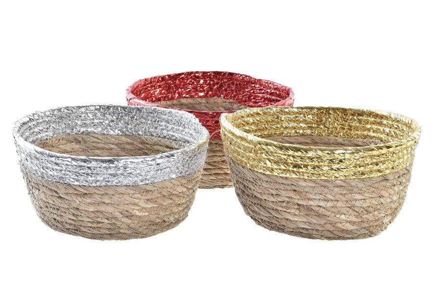 Cestos de fibra seagrassRedondas 20cm diámetro, 10cm altoColores surtidos en plata, rojo y dorado