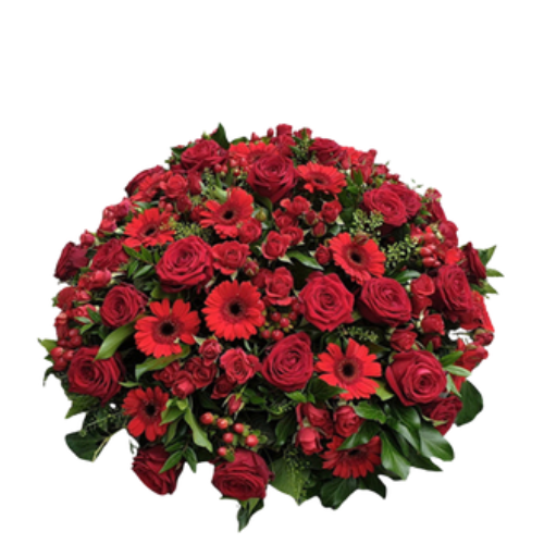 Arreglo en tonos rojos intensos, símbolo de amor profundo y homenaje solemne. Una elección que expresa respeto y recuerdo eterno.