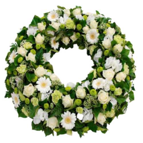 Corona de flores en tonos blancos y verdes, símbolo de paz, serenidad y respeto. Una composición clásica y solemne para rendir un homenaje digno.
