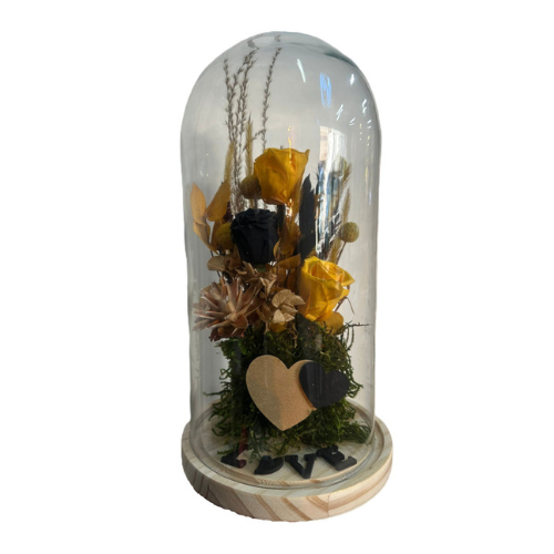 Cúpula de flor preservada. Variedad de diseños, colores, con adornos en madera,…