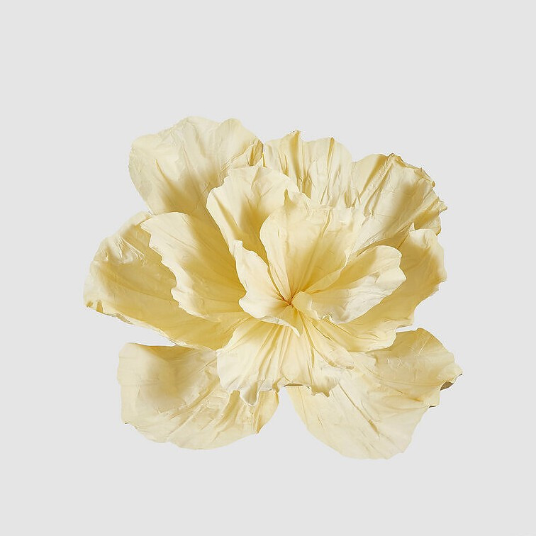 Flor de peonia gigante para colgar. En color amarillo. Dimensiones: 60cm de altura y 80cm de diámetro.