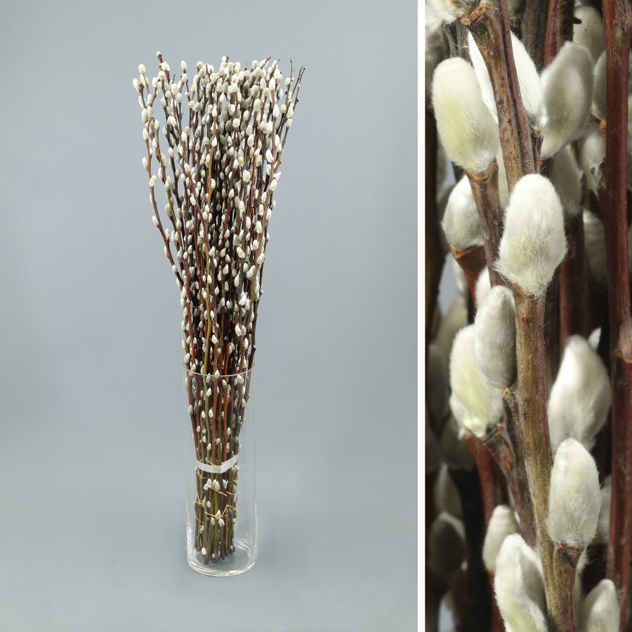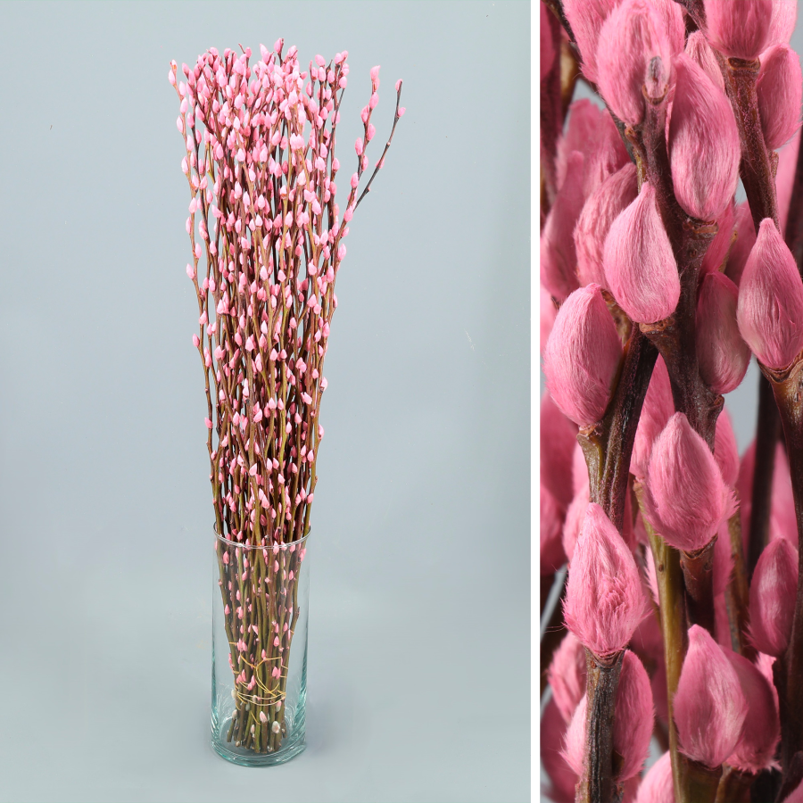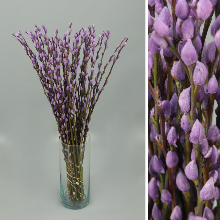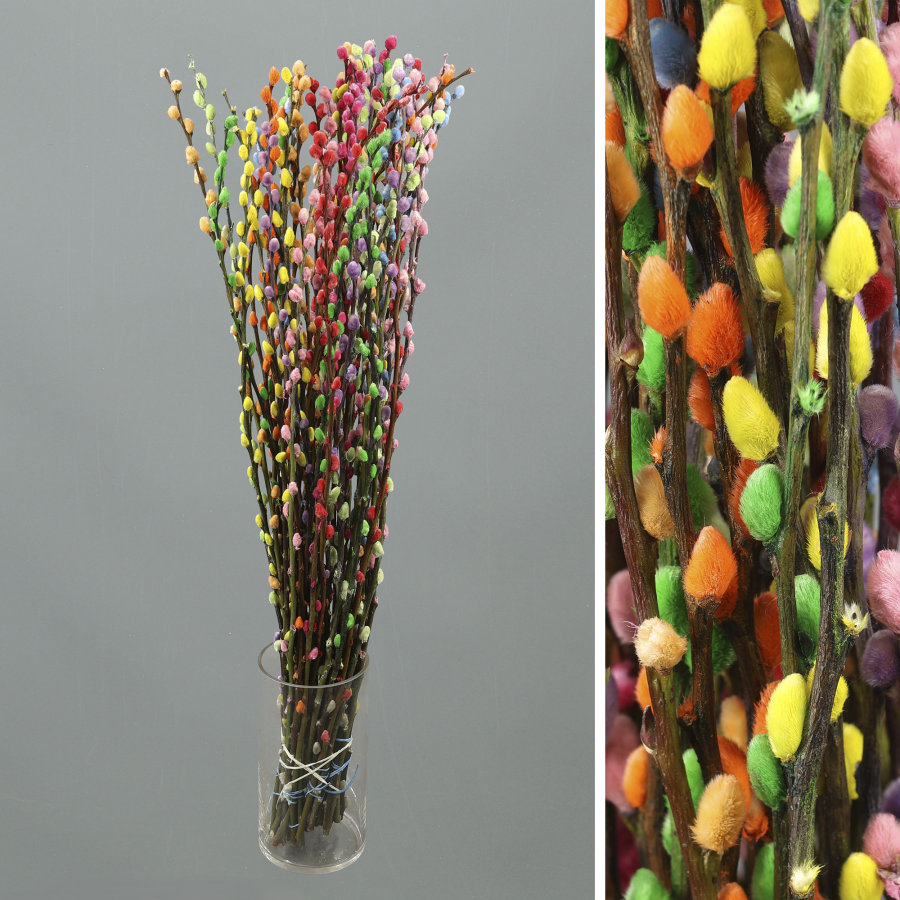 Ramas de salix en diferentes colores, blanco, lila, rosa claro y arcoiris.